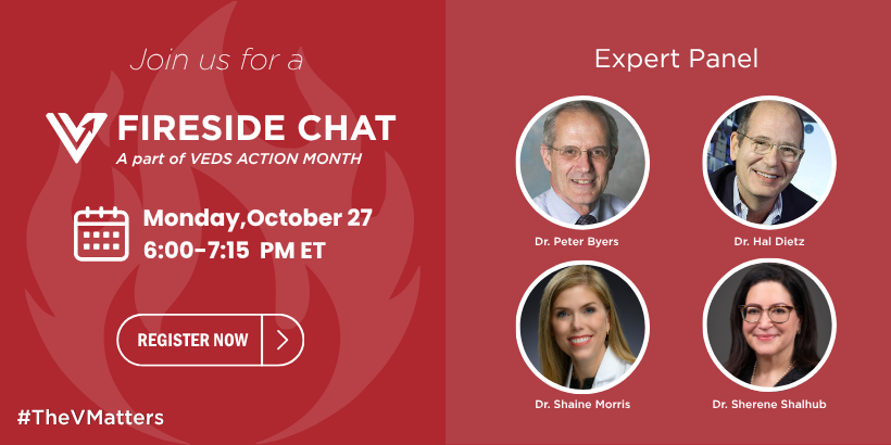 Join leading experts in Vascular Ehlers-Danlos syndrome (VEDS) for a special Action Month Fireside Chat. In this webinar, Drs. Sherene Shalhub, Peter Byers, Hal Dietz, and Shaine Morris will answer questions submitted by the VEDS community ahead of time, covering key topics like diagnosis, management, research, and living well with VEDS.